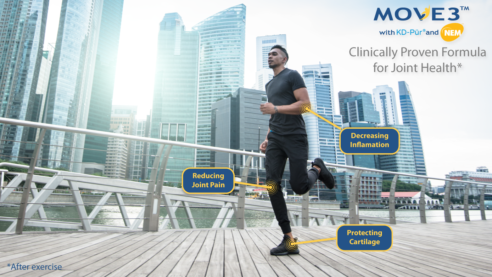 In healthy adults who performed an aerobic step exercise regimen for two weeks, daily administration of a novel nutraceutical (Move3®), consisting of eggshell membrane and fish oil (ES-OM3) decreased levels of CTX-II, a biomarker for cartilage degradation. ES-OM3 supplementation provided rapid relief of joint pain and stiffness immediately after exercise and 12 hours post exercise. Use of a nutraceutical such as ES-OM3 (Move3®) is a promising new approach for alleviating joint pain and stiffness associated with exercise.