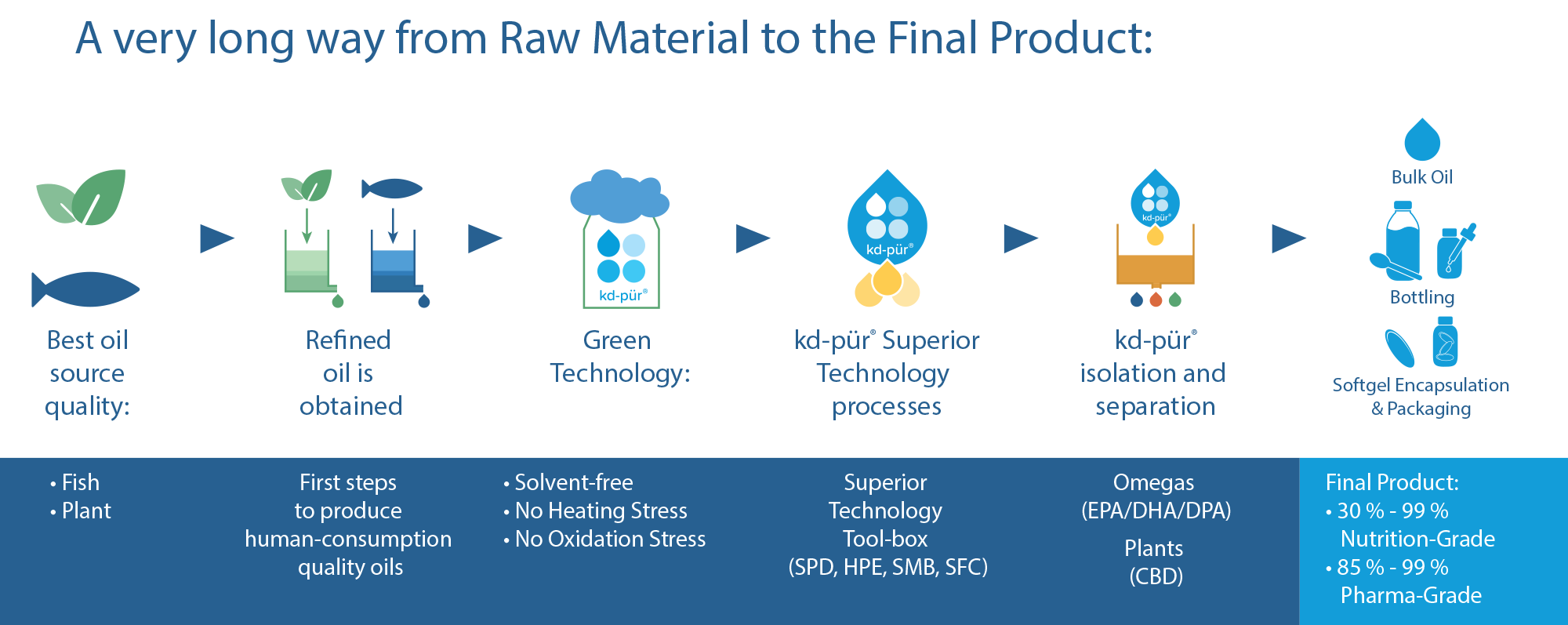 Unlike some other extraction methods, with kd-pür® technology, no chemical solvents, water, sugar, saturated fatty acids, cholesterol or proteins can be found in the finished oil.